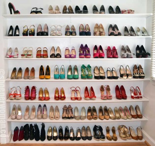 I need to figure out a better way to organize my shoes. This is, I am not kidding, one of the major concerns of my life at the moment, which probably means I should give a hundred bucks to Planned Parenthood and also join the Peace Corps? But guys, an over-the-door pouch situation and a three-foot-high pile in the coat closet do not an efficient system make. In a world of infinite space and even color distribution, I would want something bookshelfy like the below, but in my reality this would be a cramped Ikea Billy that was ¾ black and ¼ taupe. Snoozefest.